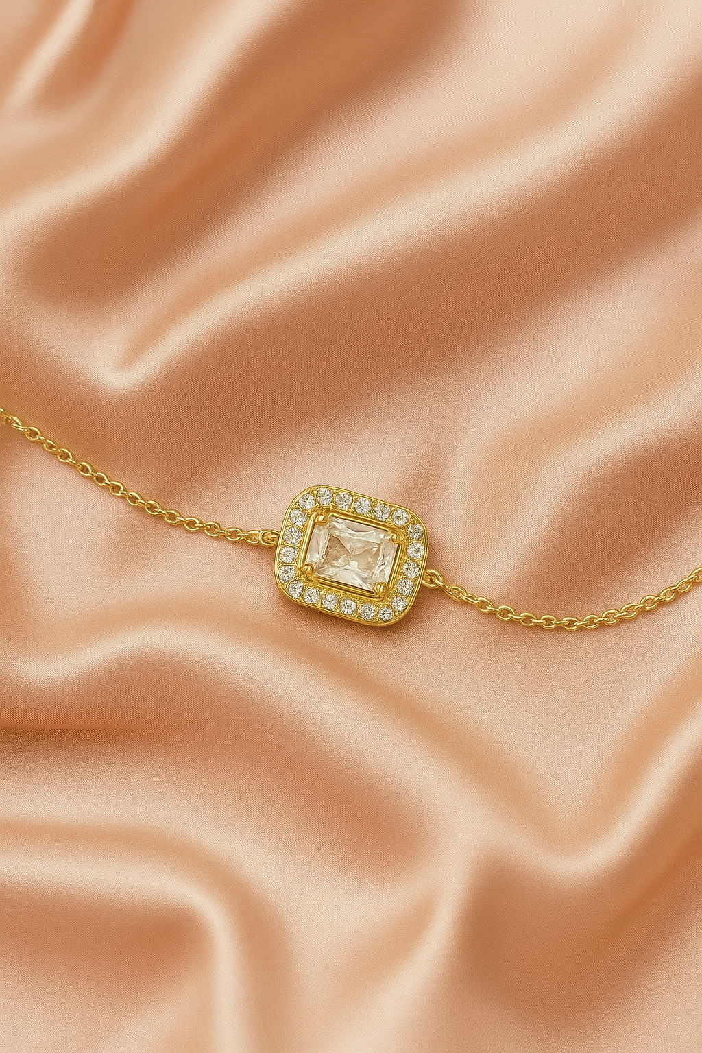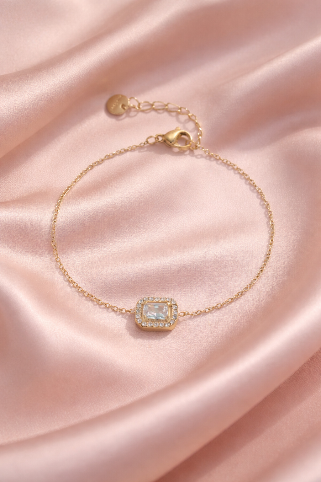 Design & Details: Ein rechteckiger Stein, umrahmt von kleinen, funkelnden Steinchen, setzt einen edlen Akzent auf dem Handgelenk.