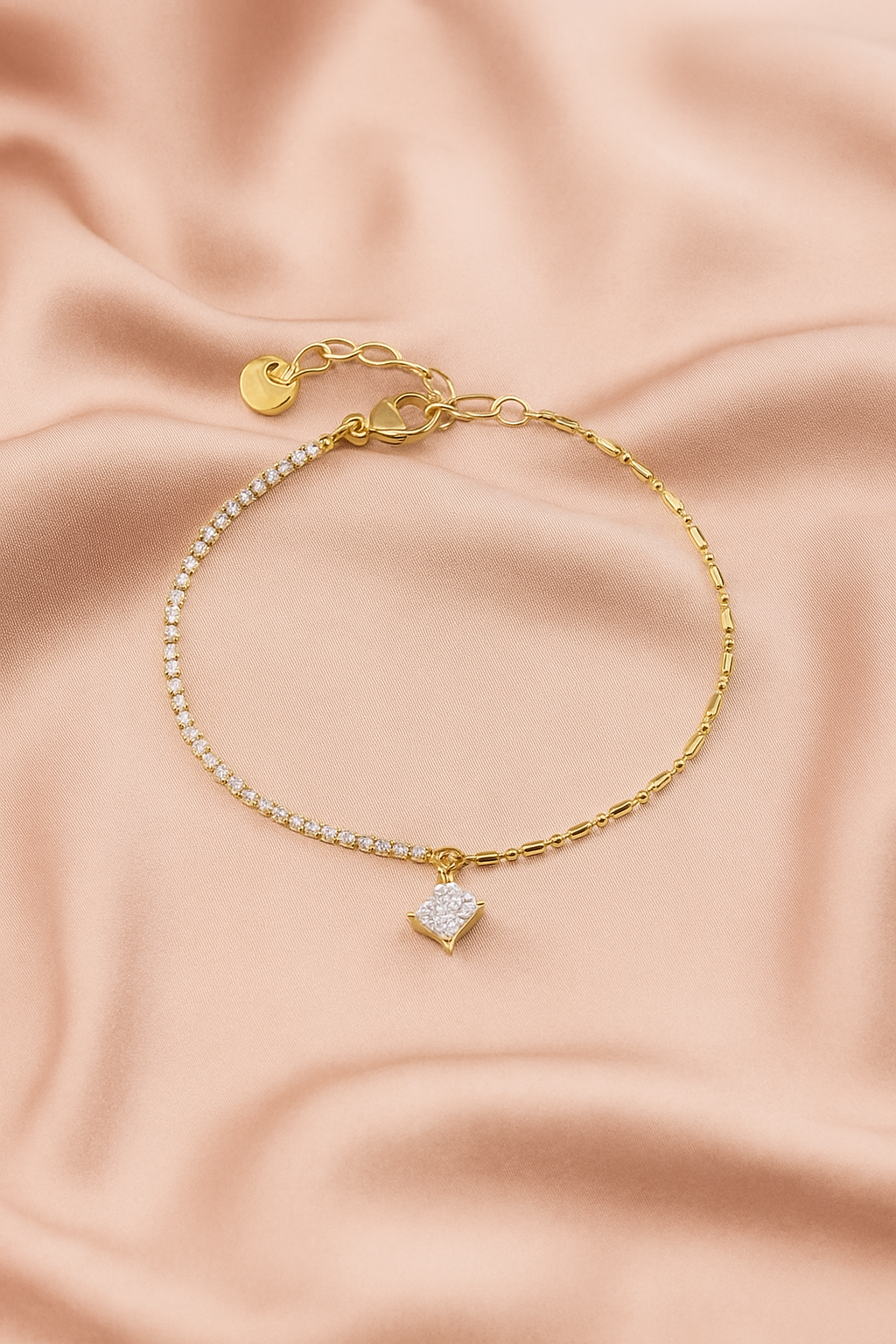 • Zart und doch ausdrucksstark : Auf der einen Seite schimmert ein zarter Anhänger liebevoll besetzt mit winzigen Steinchen – dezent, funkelnd und stilvoll. Die andere Seite begeistert mit glänzender, unaufdringlicher Gold-Optik, die dem Armband einen modernen, eleganten Touch verleiht.