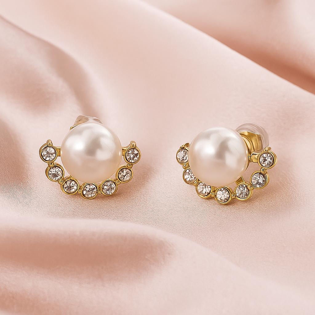 Die Maheen Ohrstecker sind die perfekte Kombination aus zeitloser Eleganz und dezentem Glanz. Im Zentrum steht eine edle, runde Perle – klassisch, feminin und immer stilvoll. Umrahmt wird sie im unteren Halbkreis von einem zarten Kranz aus feinen Steinchen, der bei jeder Bewegung dezent funkelt, ohne aufdringlich zu wirken.