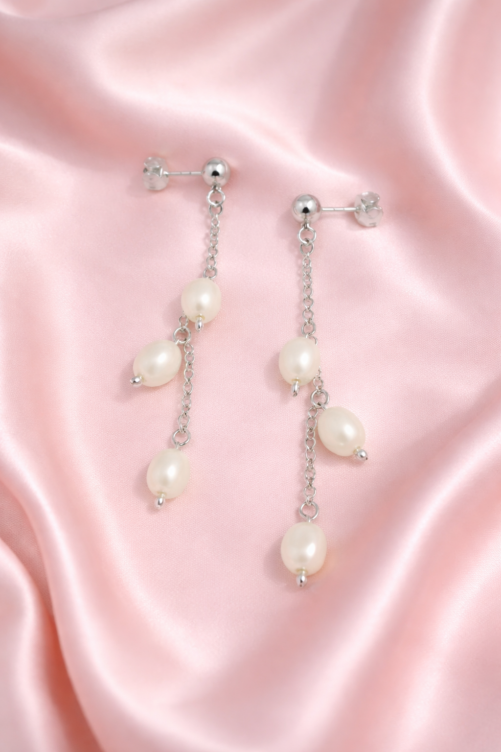 Die Elise Ohrstecker begeistern mit ihrem romantischen Design: An einer feinen, 45 mm langen Erbskette hängen jeweils drei kleine, ovale Süßwasserzuchtperlen (ca. 4,5 × 5 mm). Jede Perle ist ein Unikat, leicht variierend in Größe und Form – ein charmanter Ausdruck der Naturverbundenheit.